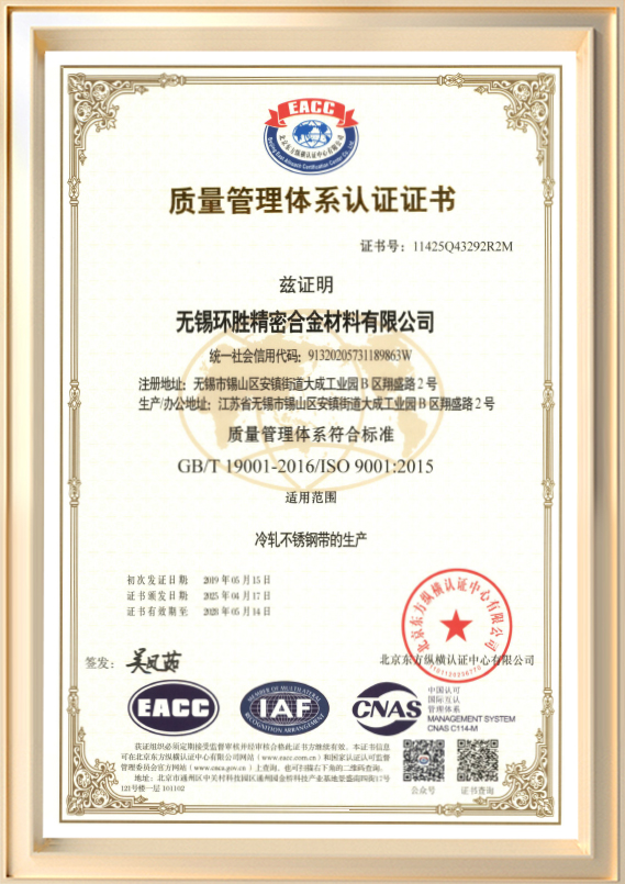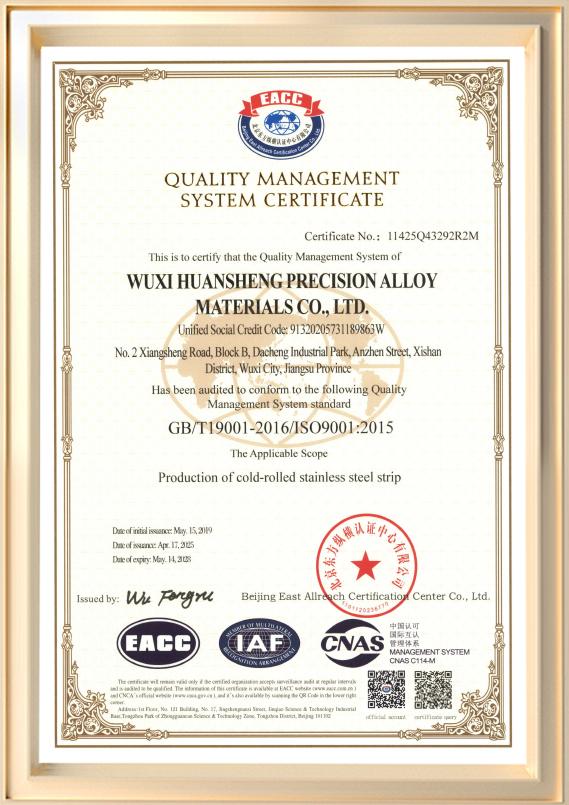 Bunaithe i 2001, is monaróir speisialaithe é Wuxi Huansheng Precision Alloy Materials Co., Ltd. (Wuxi Huansheng Metal Products Co., Ltd. roimhe seo) atá ag gabháil do T & F agus táirgeadh stiallacha cruach dhosmálta fuar-rollta. Tá caipiteal cláraithe de 60 milliún RMB ag an gcuideachta agus limistéar plandaí de thart ar 45,990 méadar cearnach, le cumas táirgthe bliantúil suas le 72,000 tonna. Raonta tiús táirge ó 0.03 mm go 3.0 mm, le leithead uasta de 550 mm.